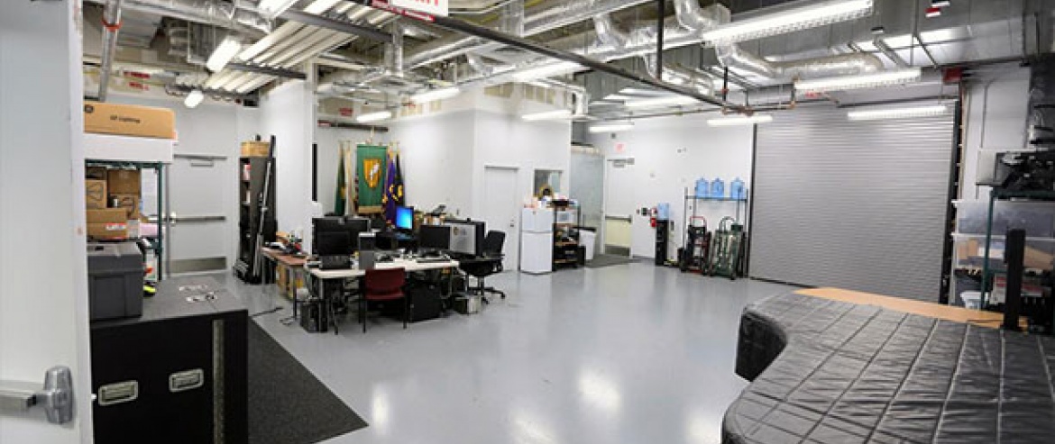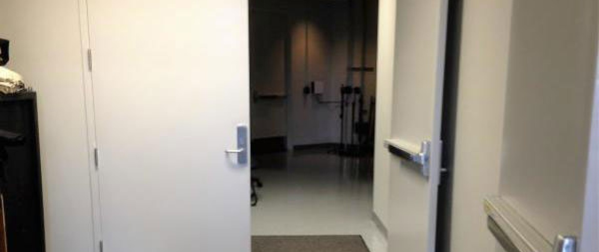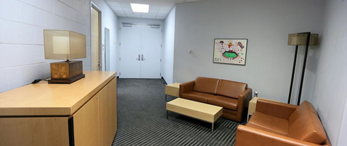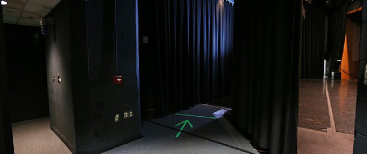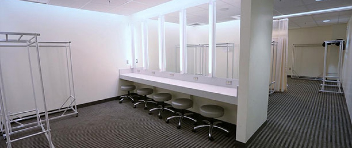 Backstage dressing room with bathrooms accessible from stage left or stage right.